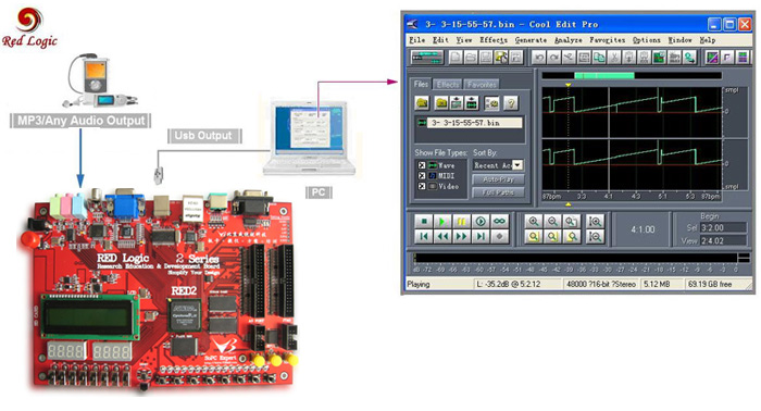USB協(xié)議是現(xiàn)在應(yīng)用為廣泛的高速數(shù)據(jù)傳輸標(biāo)準(zhǔn),教學(xué)平臺(tái)提供一個(gè)標(biāo)準(zhǔn)的USB2.0接口,以便支持高速大容量數(shù)據(jù)傳輸領(lǐng)域的開發(fā)應(yīng)用。這個(gè)實(shí)驗(yàn)展示通過(guò)USB2.0接口和PC機(jī)進(jìn)行高速通信的效果。將MP3接到LINEIN上,F(xiàn)PGA將采集到的音頻數(shù)據(jù)通過(guò)USB2.0傳輸?shù)絇C中保存。在PC使用播放軟件播放歌曲。