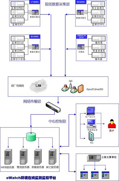eWatch環(huán)境在線監(jiān)測監(jiān)控系統(tǒng)是北京合眾普瑞科技有限公司針對鋼鐵行業(yè)環(huán)境監(jiān)測監(jiān)控實際需求而自主研發(fā)的產(chǎn)品。系統(tǒng)秉持了傳統(tǒng)與技術進步兼容并蓄的理念,按照信息化理論和軟件工程的思想,充分深入用戶的需求,其不僅架構完整、易于組建大型監(jiān)控系統(tǒng)、實現(xiàn)傳統(tǒng)意義上環(huán)境監(jiān)控、圖像監(jiān)控,還能實現(xiàn)數(shù)據(jù)量的遙測、遙信。可通過整合匯總各類污染源和環(huán)境信息,進行集中統(tǒng)計分析,及時掌握污染源及環(huán)境排放狀況,以及兩者之間的輸入響應關系,及時為公司管理部門各級領導提供環(huán)境管理決策依據(jù)。