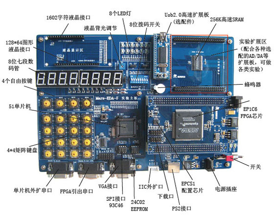 板上有標準DC接口,板載FPGA---EP1C6 和PROM—EPCS1配置芯片,板上同時提供JTAG接口和AS編程下載接口。